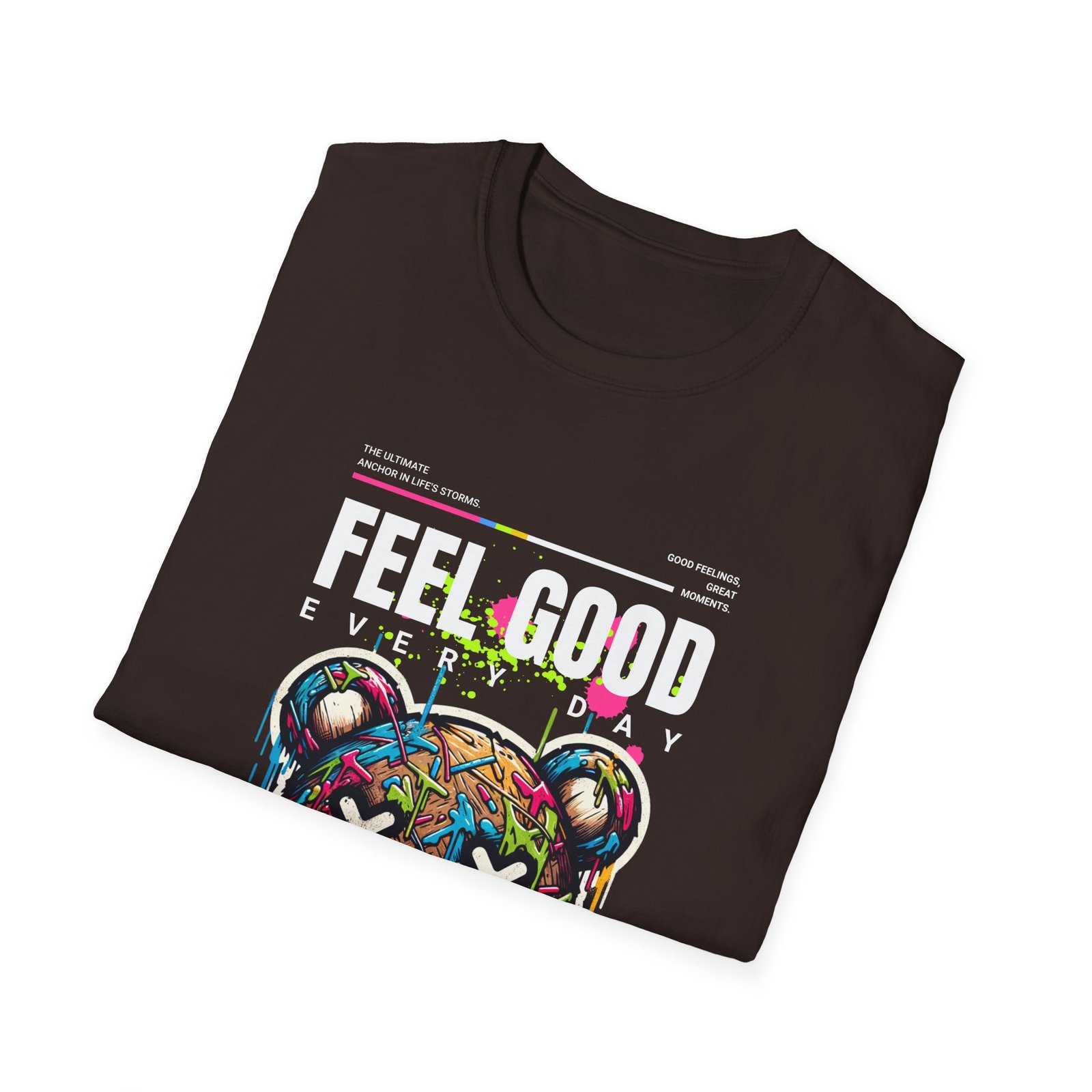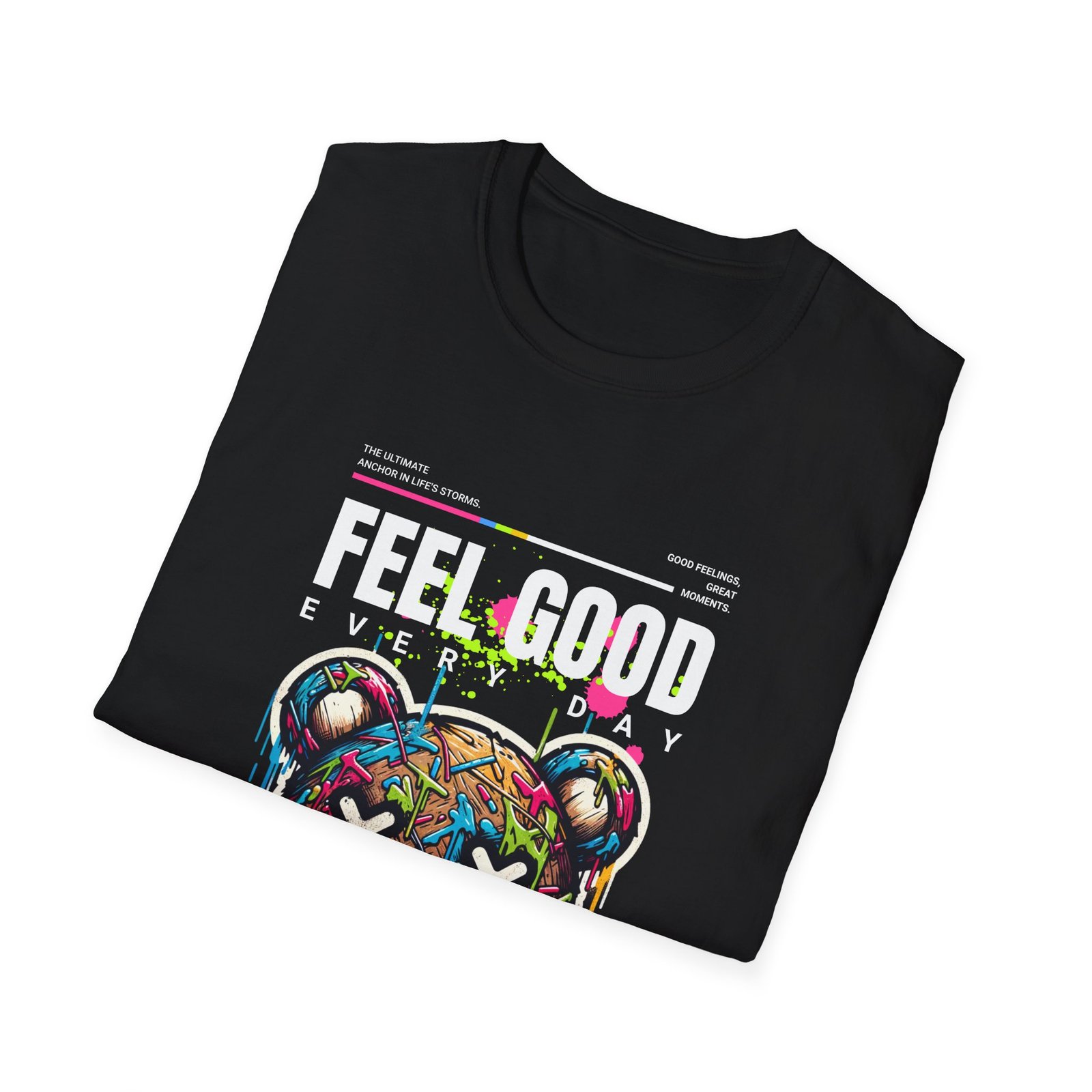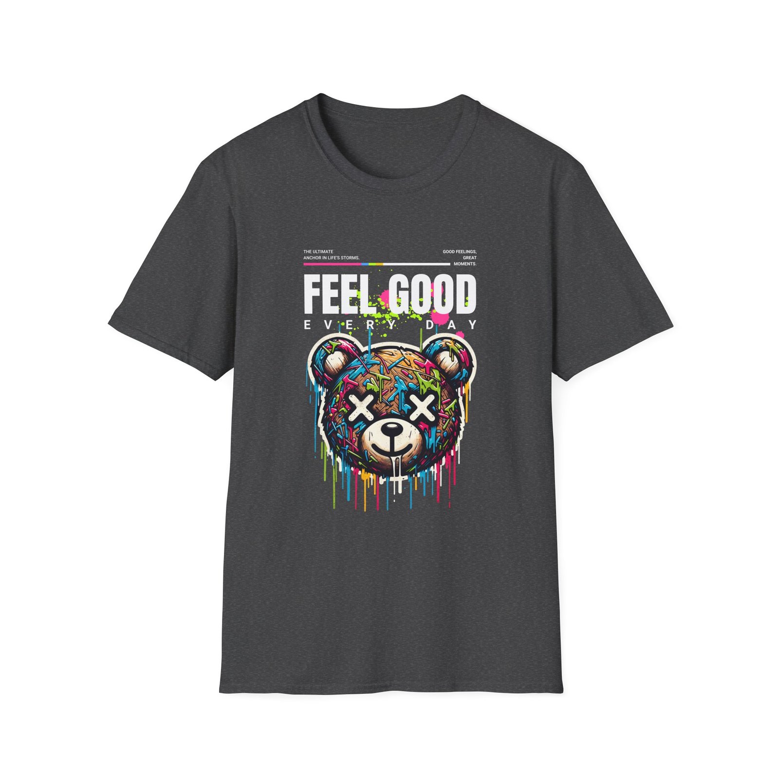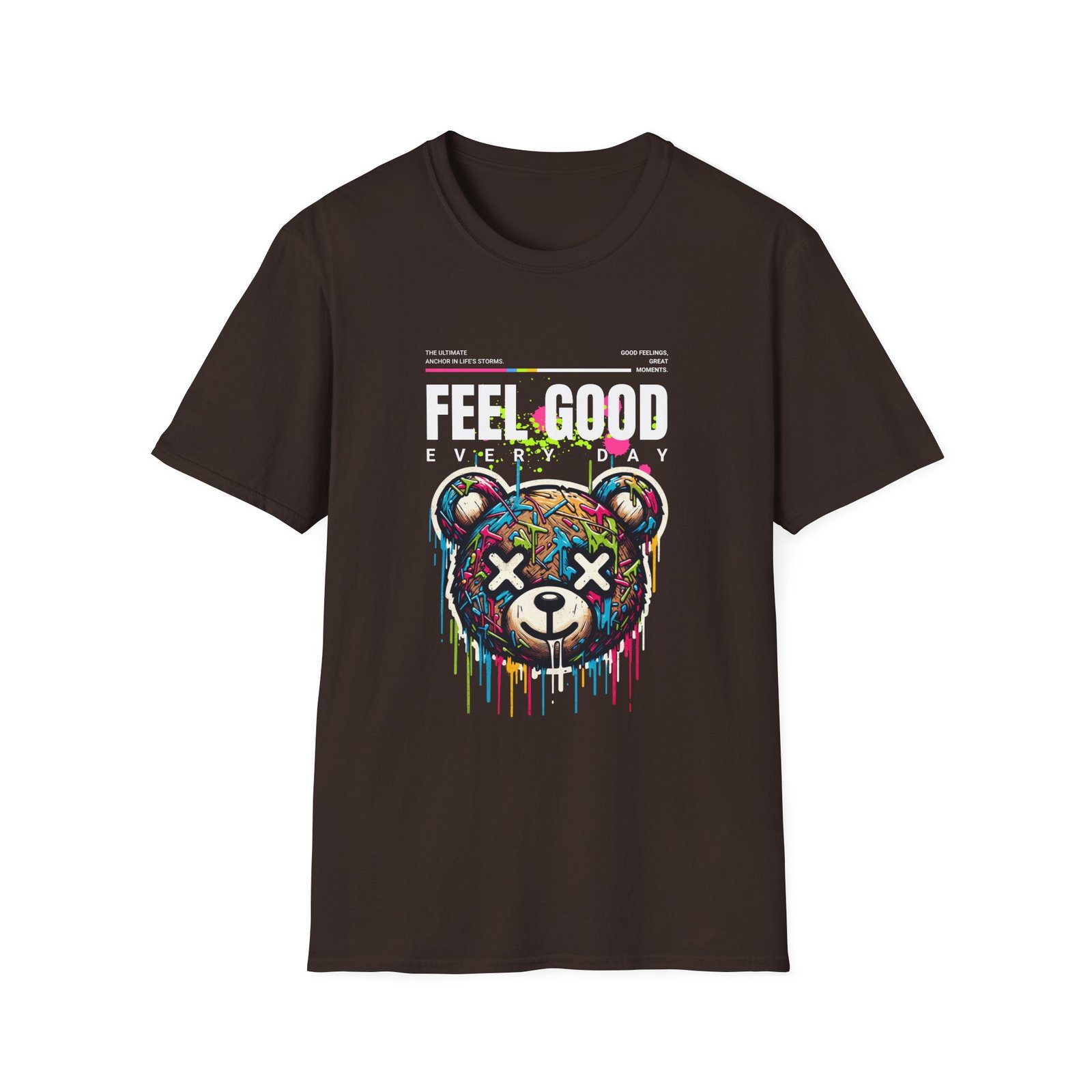 Crafted on the Gildan 64000 Softstyle T-Shirt, the Feel Good Bear tee is lightweight, soft, and built for daily wear. Its semi-fitted cut holds shape without being too tight, while the bold print pops against the black canvas.